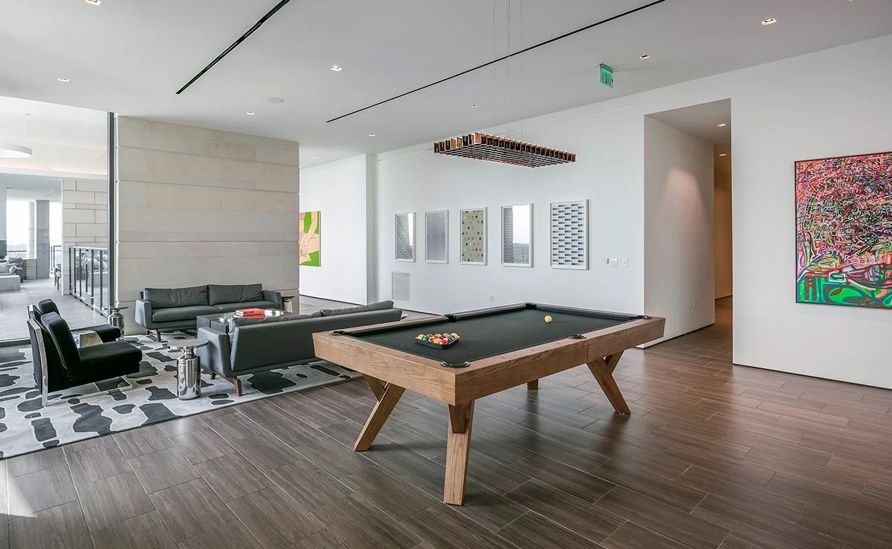 Enjoy the day in our linear rooftop pool with dramatic views of downtown Houston, a social lounge with a big-screen LED TV, a library, table games, dramatic views, and an eclectic food and beverage experience.